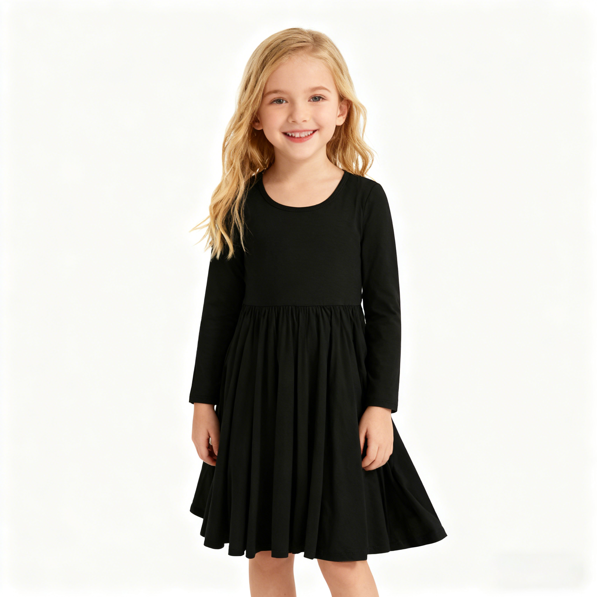High Quality Little Kids Black Bamboo Spandex Swing Dress Long Sleeve Casual Soft Summer One Piece Baby Girls Twirl Dresses - Image 2