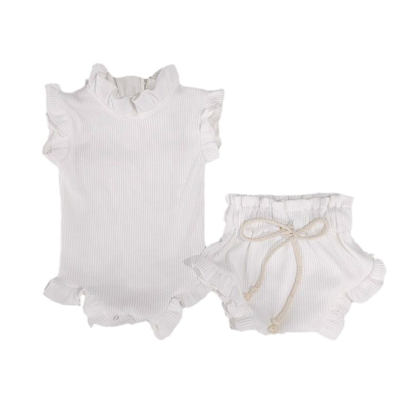 Hot Selling 95% Cotton 5% Spandex Baby Romper Ruffle Bodysuit with Shorts Lotus Leaf Pants Bloomer Sets Infant Ribbed Clothing